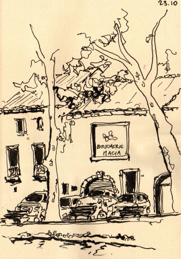 Quand je dessine en vacances ou en déplacements, je garde l’esprit Urban Sketchers, avec une touche carnet de voyage. Je m’installe, plus ou moins confortablement et je transcris ce moment dans un carnet. Je ne cherche pas à définir mes croquis, ils font juste partie de ma vie.