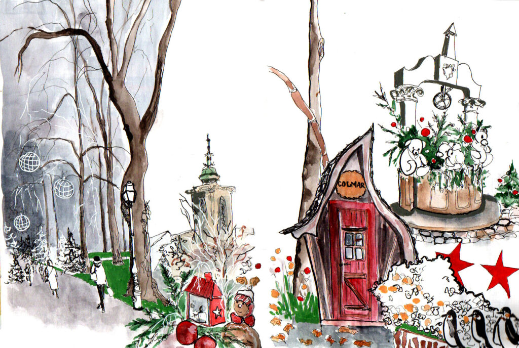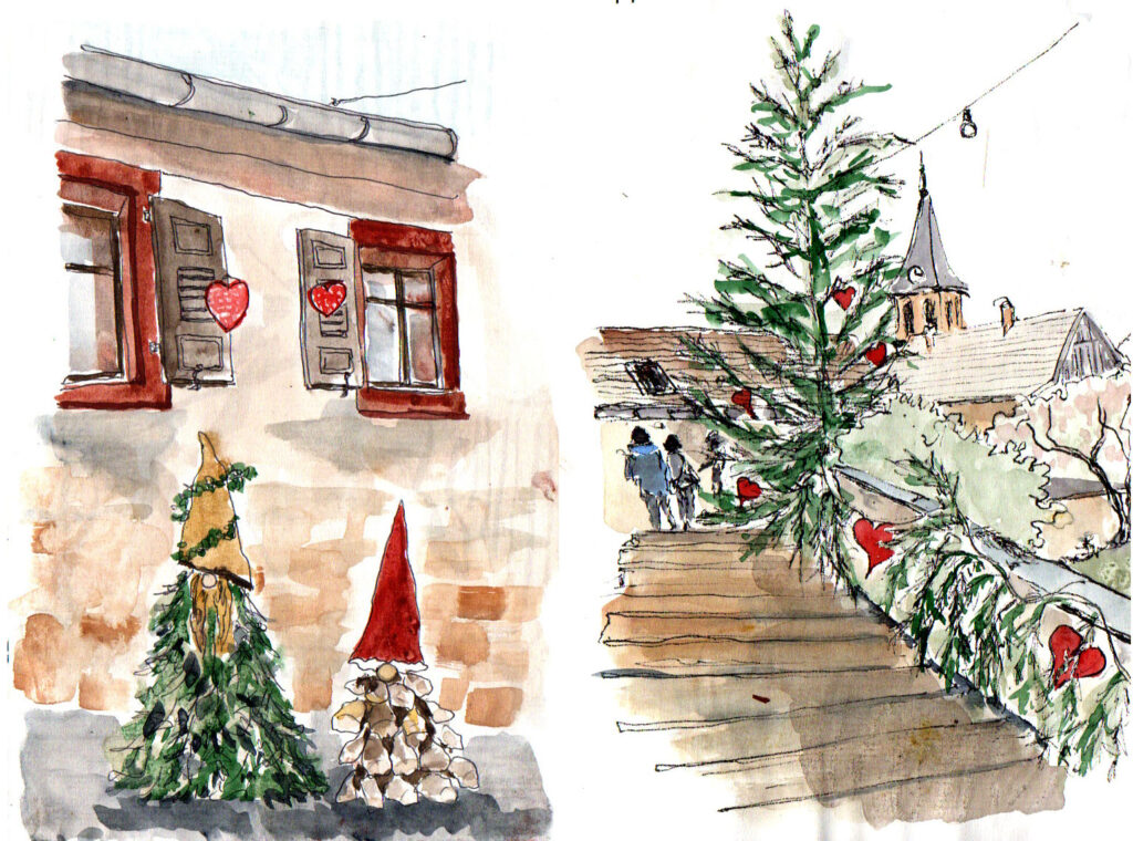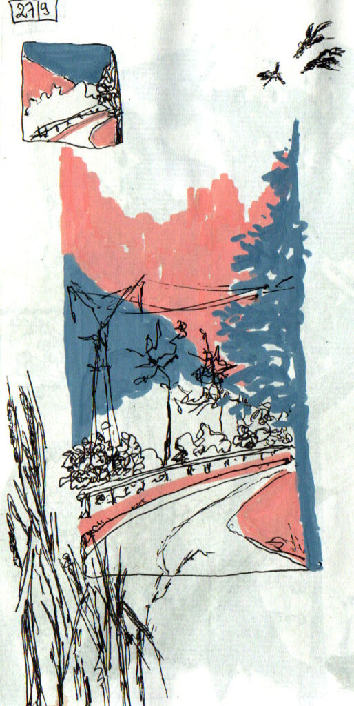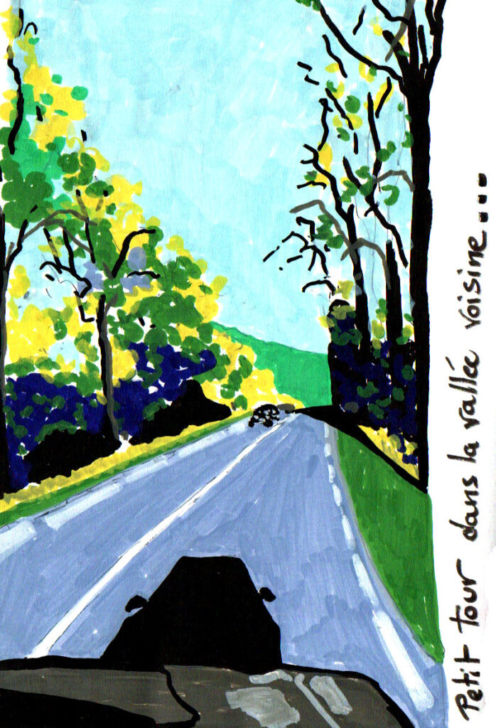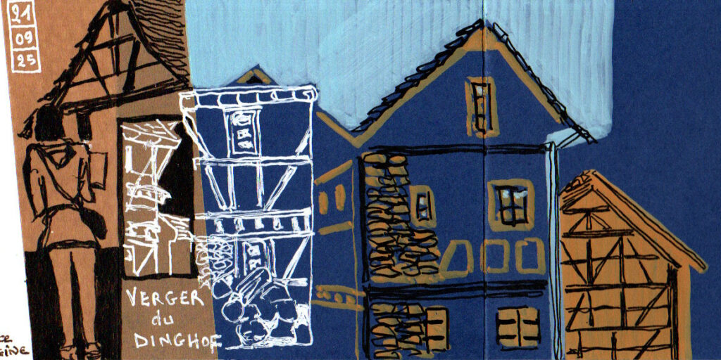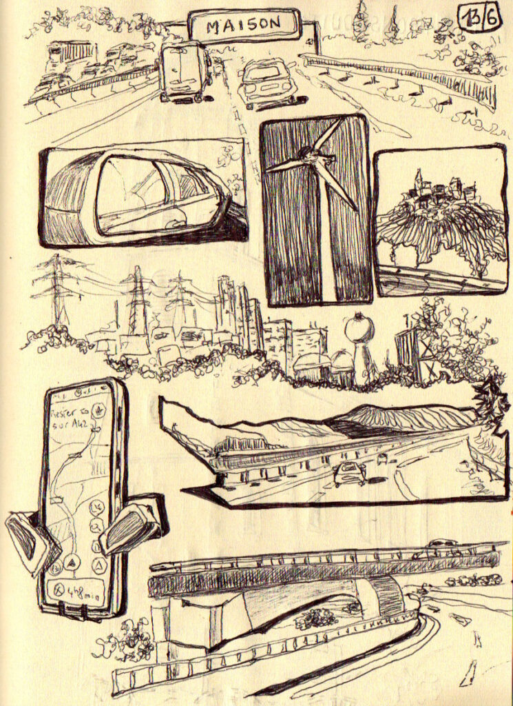 Entre deux rendez-vous, par un froid qui ne donne pas envie de me poser dehors, je fais des croquis sur les parkings de Villé, abritée dans ma voiture. Un stylo noir, un feutre bicolore et c’est déjà l’heure…