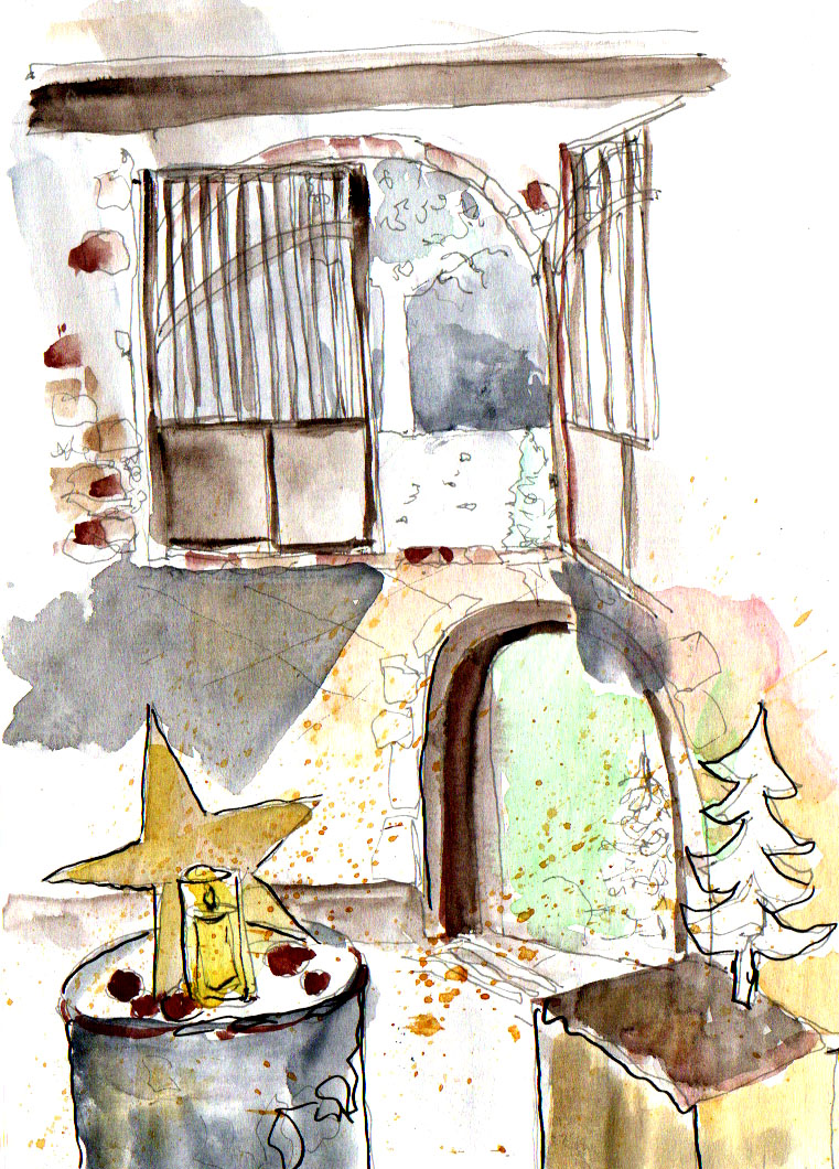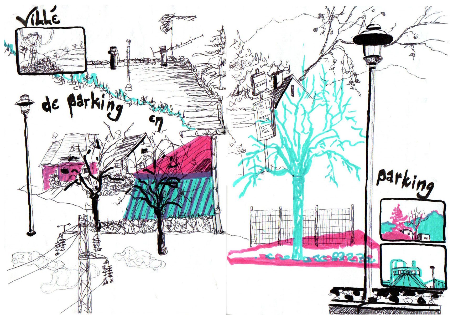 Entre deux rendez-vous, par un froid qui ne donne pas envie de me poser dehors, je fais des croquis sur les parkings de Villé, abritée dans ma voiture. Un stylo noir, un feutre bicolore et c’est déjà l’heure…