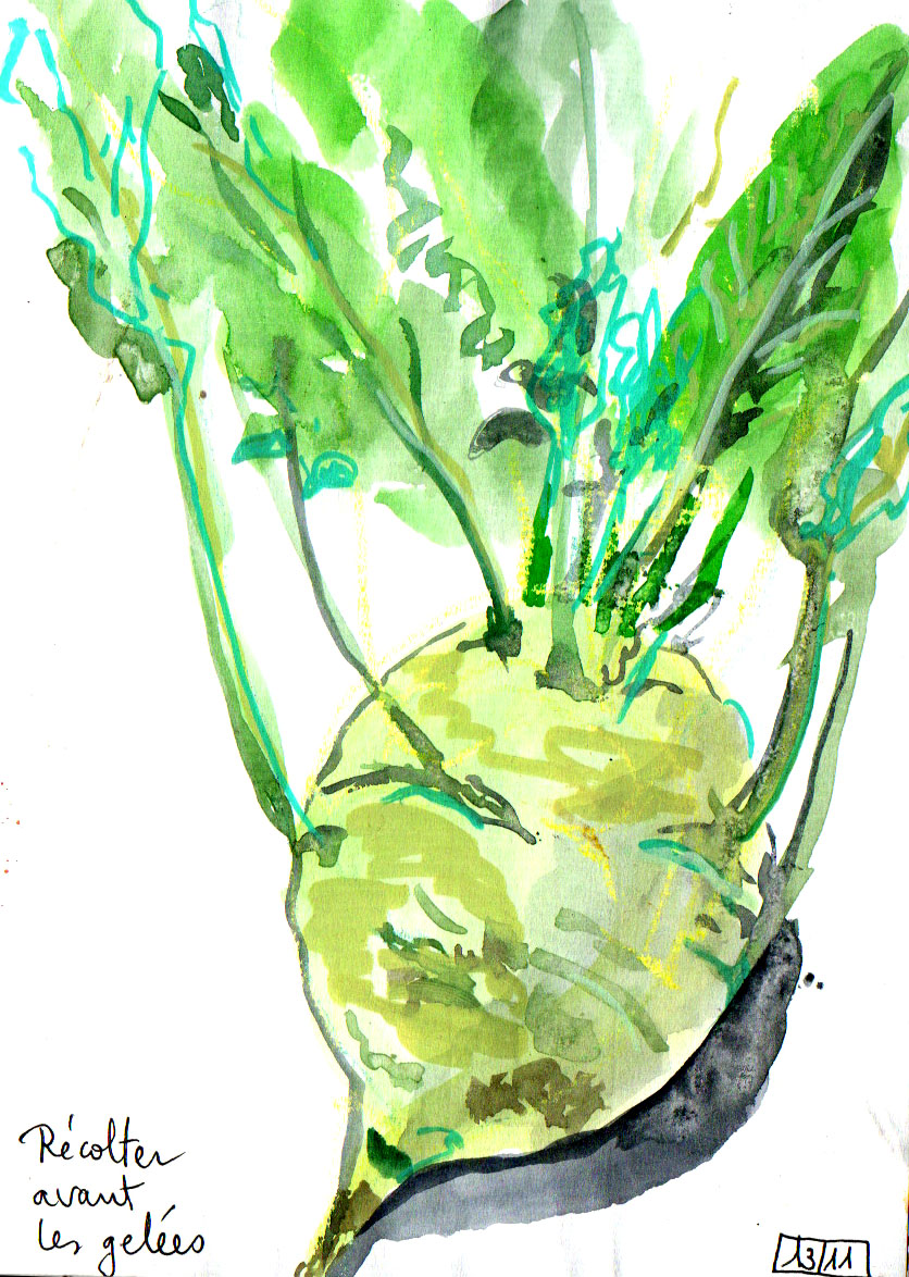 Novembre n’est pas le mois que je préfère. J’ai dû me secouer un peu plus encore pour garder le rythme du croquis quotidien. Les journées raccourcissent, la nature change, le jardin m’appelle encore, je le bichonne pour son entrée dans l’hiver. Dernières récoltes pour les légumes qui le réclament et belle découverte de la culture du crocus sativus. On s’émerveille de ces fragiles stigmates de safran, merci C. pour ce partage.