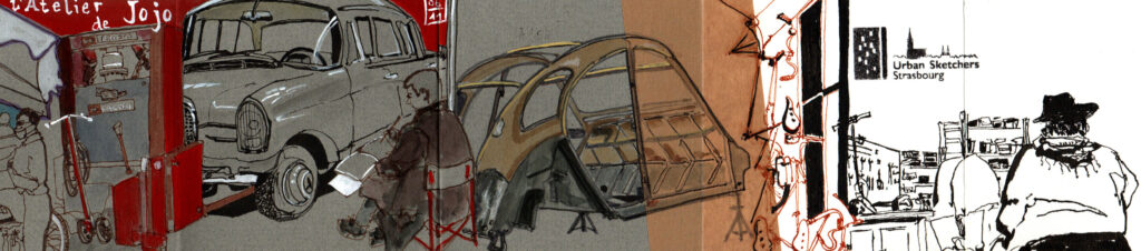 En début mois la rencontre USK a eu lieu autour de la Galerie du Porche située rue Stoeber à Strasbourg. Notre groupe a pu y exposer carnets et reproductions de croquis réalisés dans le quartier, « A 10 minutes à pied ». L’idée était de faire connaître le mouvement des Urban Sketchers et de présenter nos travaux qui diffèrent tous par leurs techniques, outils, gestes et points de vues. Ce jour-là j’ai tenté de dessiner la passerelle Ducrot. J’ai préféré la tronquer devant la difficulté.