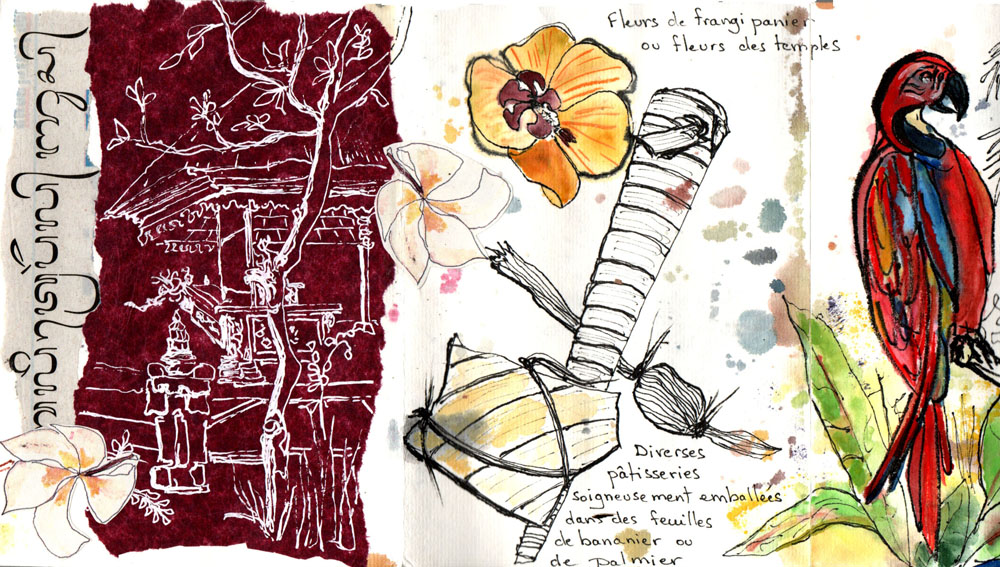 Ambiance de rue, des étals de nourriture, des scooters, des éclats de voix, des odeurs mêlées d’encens, d’iode, de plats cuisinés, de grillades de poissons. S’asseoir au milieu de tout ça, boire un jus de noix de coco fraîchement coupée à la machette et laisser filer stylo et pinceau…