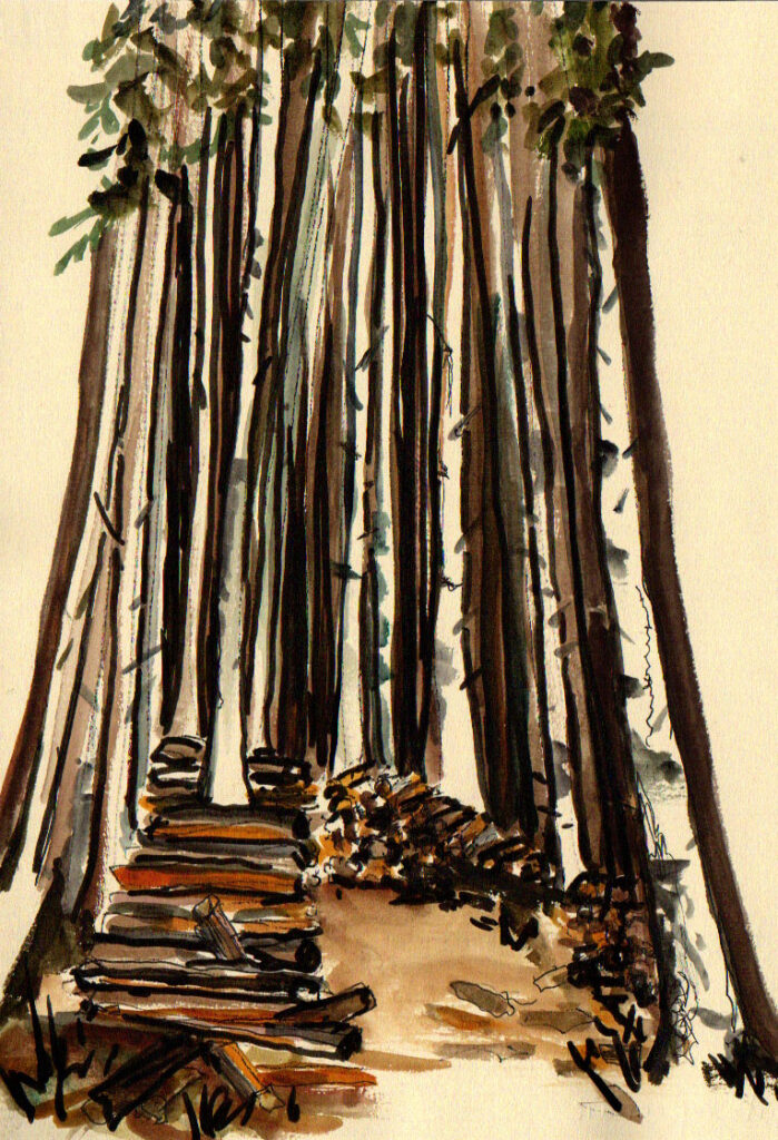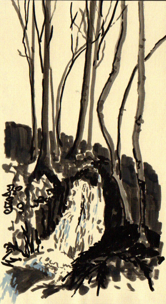 Le moment serait venu de s’occuper de nos plants de framboises, mais le sol est détrempé. A défaut de travaux de jardinage, entre deux averses, nous marchons, les pieds dans la boue. La cascade a pris du volume, le bruit de l’eau se fait plus présent.