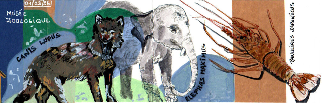 Premier dimanche du mois, rencontre USK au Musée zoologique de Strasbourg. Cela fait très longtemps que je n’y avais plus été. Fermé depuis quelques années pour cause de rénovation, je suis curieuse. Nous ne sommes pas les seuls à avoir cette idée de sortie dominicale ! Le vrai défi pour moi aura été de trouver une place pour dessiner !
