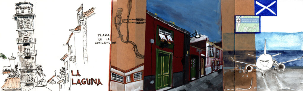 Des retrouvailles en famille pour ces vacances aux Canaries, au large du Maroc. Dès l’arrivée à « l’aeropuerto Tenerife sur » on se sent ailleurs. Je commence à dessiner des palmiers pour me mettre dans l’ambiance en attendant que nos hommes s’occupent de la location du van. Puis, direction El Medano, voir la mer et retourner à l’aéroport cueillir notre fille avant de partir vers « La Laguna » où nous attend notre nièce qui sera notre guide et interprète durant ce séjour. C’est bon de se retrouver. C’est bon de se poser dans un nouveau décor.